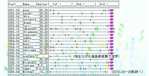 後記;この表は小生が一番参考にし,指導上極めて有効であった.全体の施行状況をよく把握でき,遅れる人はいなかったが,万一遅れた場合,対処がし易かったであろう.プライバシーに関しては,このおかげで年限超過なんていなかったから,ゴメン堪忍.