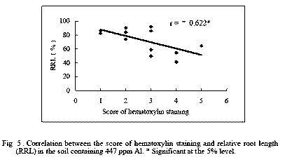 The score of hematoxylin staining showed a significant correlation (r = 0.666**) with that of RRL (Fig.4). Genotypes that showed tolerance with the hematoxylin staining method showed also tolerance with the growth-response method (Table 3). Polle et al. (1978) reported that the results of the hematoxylin test were in good agreement with those of the acid soil-screening method in wheat. Takagi et al. (1981) also reported that scoring of Al tolerance of wheat by the hematoxylin staining method strongly coincided with the scoring of Al tolerance in nutrient solution with Al.