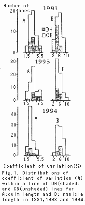 Fig.1(19KB) shows the distribution of coefficient of variation within a line for the traits calculated. Student's t-tests in Table 4 revealed no significant differences between DH and CB lines except panicle length in 1991. CB lines in 1991