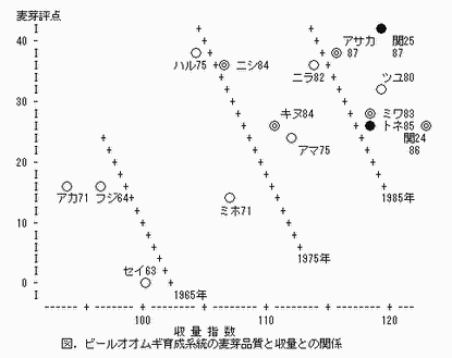 同時代の比較では収量と品質(麦芽評点)に負の関係があるが,時代とともに収量,品質が右上の方向に改良されて行っている.