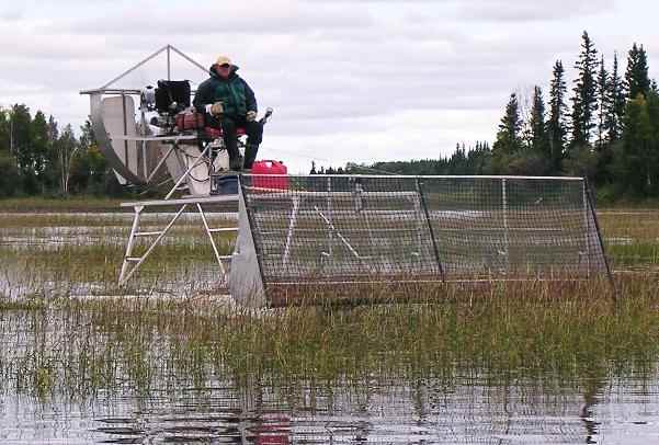 ワイルドライスの上を航行するスピードは、10マイル/h(約16km/h)前後がベストだという。また、このボートは、水中のスクリューではなく、後部に設置された直径1.5mほどのファンによる風圧を推進力とする。これは、水中スクリューの場合、スクリューにワイルドライスの茎葉が絡まり航行が困難になるため、また、その回転によりワイルドライスを痛めてしまうためと考えられる。これらを防ぐために、前述したようなファンが採用されたのであろう。