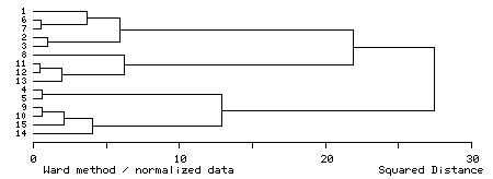 多くのデータから似通った個体にグループわけする.個体相互間の距離(多次元空間上の)を計算し,距離の近いもの同士が隣接するような図,つまり下図のようなデンドログラム(樹状図)として表現する.